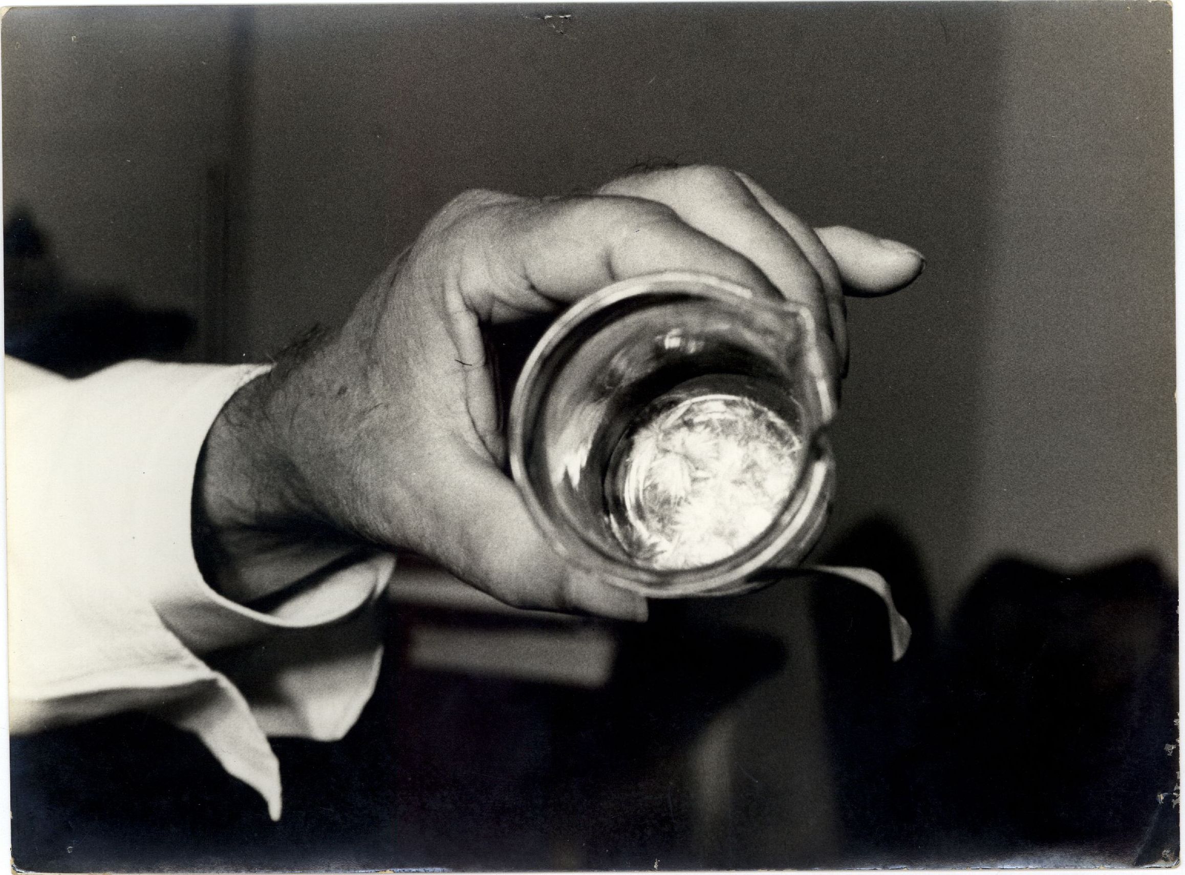 Description: Registro em preto e branco onde é possível visualizar uma mão segurando um frasco de vidro com um conteúdo não identificado em seu interior. Informações encontradas no verso das fotografias "Universidade Federal de Pernambuco; Assessoria Especial de Relações Pública; Local da foto: Instituto de Antibióticos; Solenidade: Programa especial Aniversário TVU; Data; Visto".