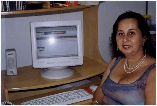Description: Fotografia em cores onde é possível visualizar a Diretora da Biblioteca Central, Conceição Torres, sentada em frente a uma mesa que dá suporte a um computador da marca Samsung. No verso da foto encontram-se as seguintes informações "Assessoria de Com Social - UFPE; Nome: DC: Evento/Pessoa: Conceição; Fotógrafo: Mila Targino; Fev 2002".