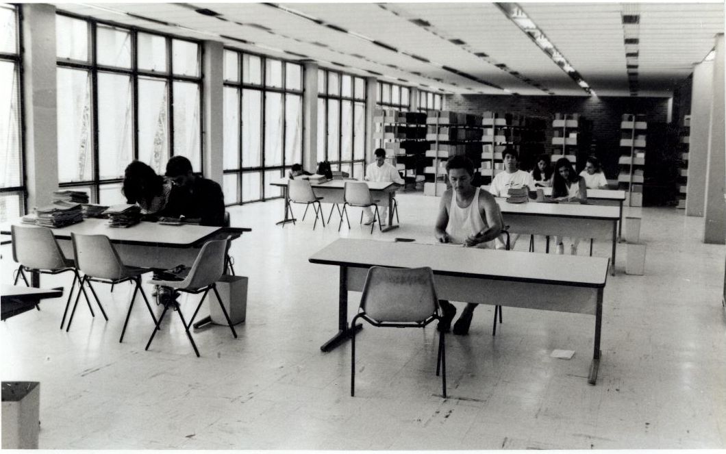 Description: Fotografia em preto e branco do interior da Biblioteca Central, nela podemos observar uma área destinada aos estudantes com mesas e cadeiras, ao fundo, livros para consulta.