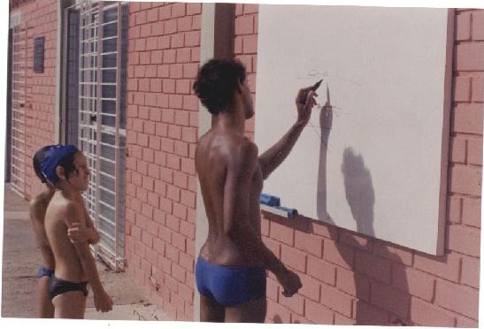 | Description: | Fotografia em cores onde é possível visualizar uma personalidade não identificada escrevendo algo em um quadro, estando duas crianças prestando atenção no escrito. |