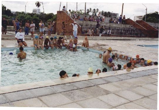 Descripción : Fotografia em cores onde é possível ter uma visualização ampla de uma área do NEFD onde se encontra uma piscina e uma arquibancada, ambas com grande quantidade de pessoas (a maioria crianças). No verso da foto consta a seguinte informação escrita à caneta: “filme 25437; Assessoria de COM Social – UFPE; Nome: Esportes p/ comunidades; Evento/Pessoa: (Núc. Ed. Fís); Fotógrafo: Maurício Coutinho”.