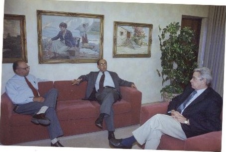 Description: Fotografia em cores onde é possível visualizar o Reitor Geraldo Pereira reunido com personalidades identificadas como Wanderley de Souza, diretor do LIKA, e o Secretário Executivo do Ministro de Ciência e Tecnologia. No verso da foto consta um adesivo da ASCOM com as seguintes informações: ASSESSORIA DE COM SOCIAL – UFPE; Nome: Evento/Pessoa: Diretor LIKA (esquerda); Sr. Wanderley de Souza; Sec. Exec. do Ministro Ciência e Tec.; Fotógrafo”.