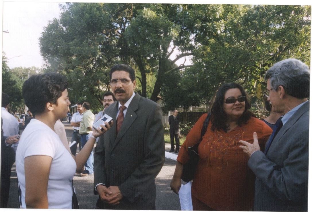 | Description: | Fotografia em cores do Prefeito da Cidade do Recife João Paulo sendo entrevistado por uma mulher e ao fundo Luciano Siqueira conversando com outra pessoa |