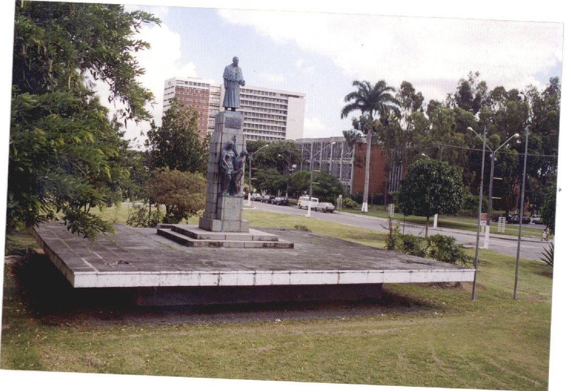 Description: Fotografia em cores onde é possível ter uma visão distante da Estátua do Reitor Joaquim Amazonas, localizada próximo a Biblioteca Central. No verso da foto consta a seguinte informação escrita à caneta: “Filme 6231”.