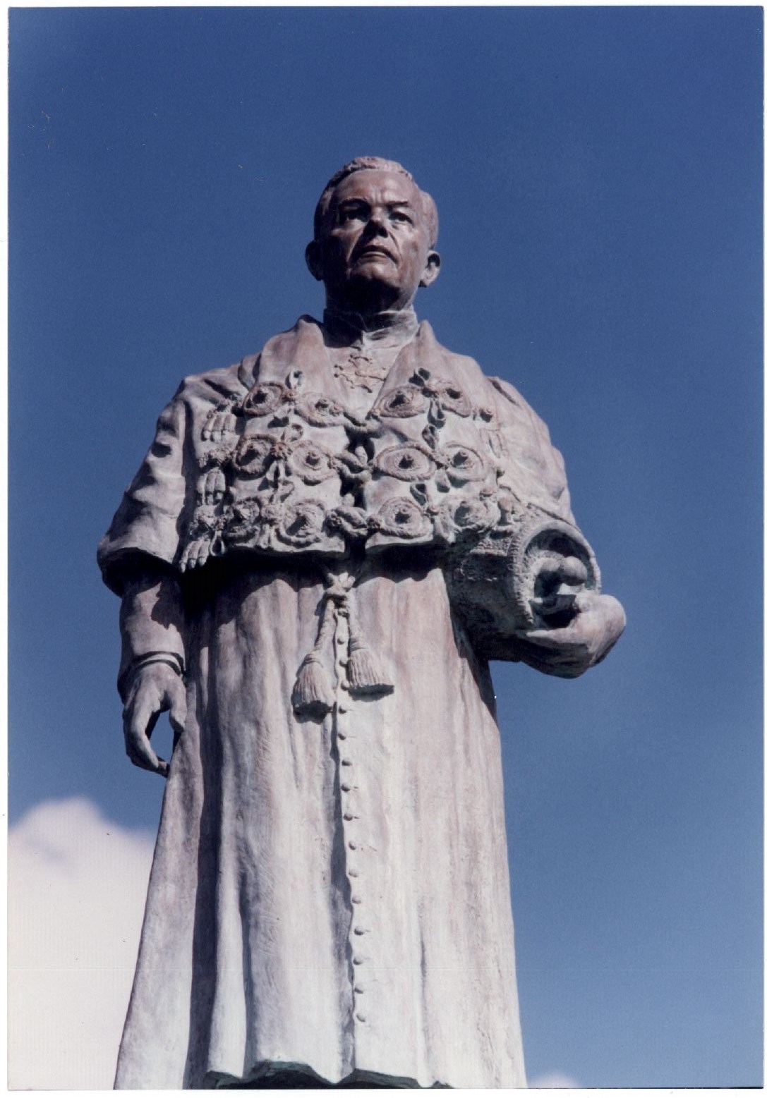 Description: Fotografia em cores onde é possível visualizar a estátua do Reitor Joaquim Amazonas. No verso das fotos consta a seguinte informação escrita a lápis: “Estatua”.