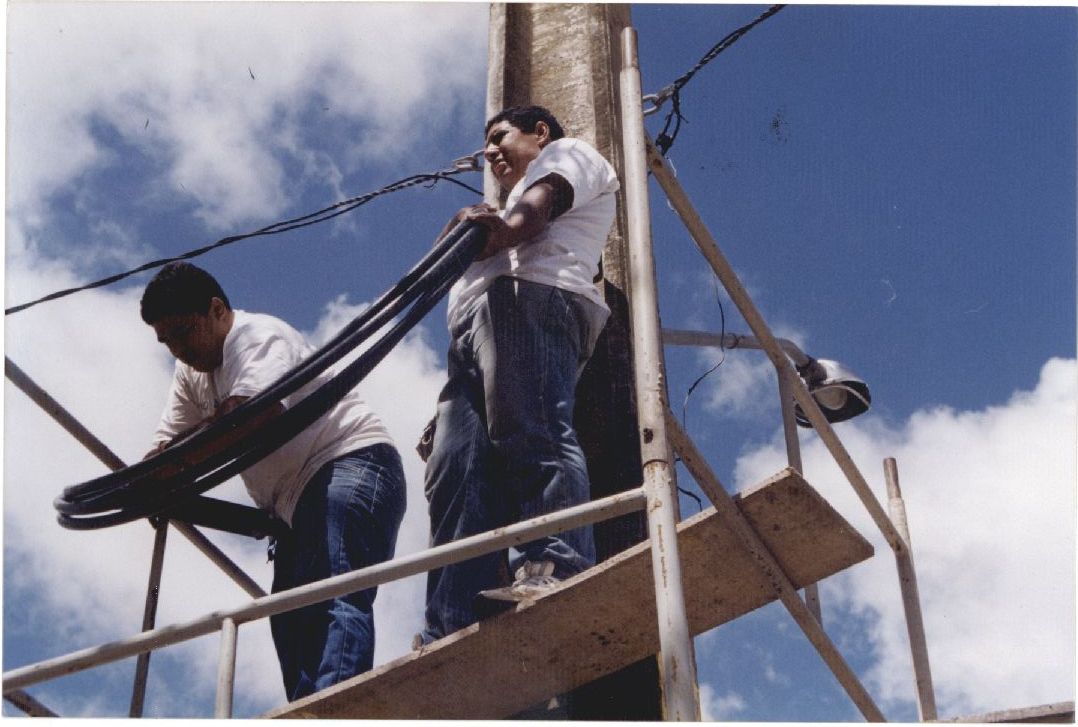 | Description: | Fotografia em cores de dois homens em cima de um apoio trabalhando na afiação próxima a um poste de luz. No verso das fotos consta um adesivo da ASCOM com a seguinte informação: "Assessoria de Com. Social - UFPE; Nome: Prefeitura; Evento/Pessoa: Centralização Energia elétrica; Fotógrafo: Bárbara”. |