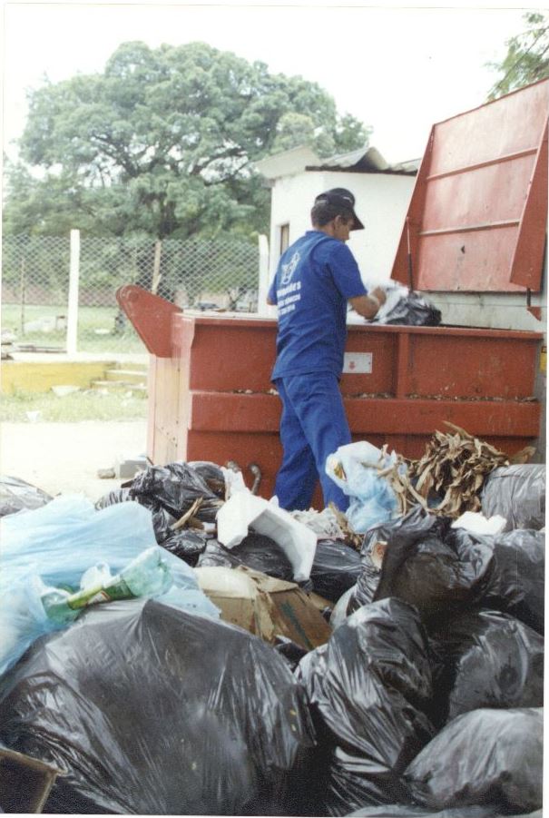 | Descripción : | Fotografia em cores onde é possível visualizar um funcionário com as mãos em um saco de lixo que está na parte interna um compressor de lixo. No verso da foto consta um adesivo da ASCOM com a seguinte informação: "Assessoria de Com. Social - UFPE; Nome: Lixo – UFPE; Evento/Pessoa; Fotógrafo: Raquel Santana |