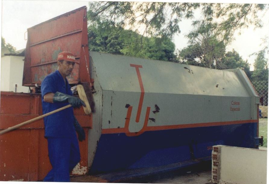 | Descripción : | Fotografia em cores onde é possível ver um funcionário ao lado de um compressor de lixo segurando uma vassoura. No verso da foto consta um adesivo da ASCOM com a seguinte informação: "Assessoria de Com. Social - UFPE; Nome: Lixo – UFPE; Evento/Pessoa; Fotógrafo: Juliana Albuquerque”. |