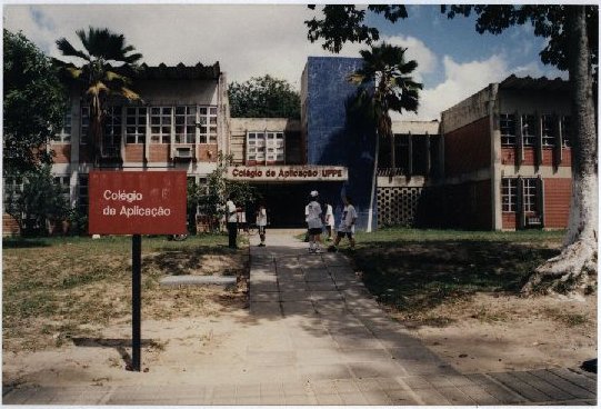 | Descripción : | Fotografia em cores da placa de identificação do CAP e de alguns alunos na entrada principal do Colégio Aplicação |