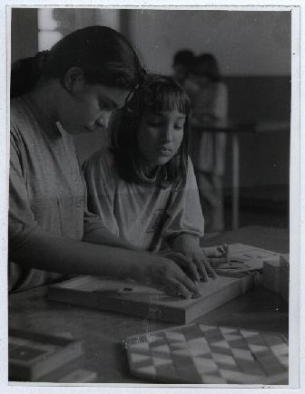 Descrição: Fotografia em preto e branco de alunos do CAP manuseando jogos de concentração e encaixe.