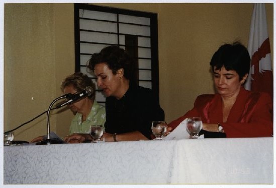 | Descrição: | Fotografia em cores de três mulheres sentadas à mesa utilizando microfone em evento do CAP. No verso das fotos consta um carimbo da ASCOM com a seguinte informação à caneta: “Assessoria de Com. Social – UFPE; Nome: Colégio de Aplicação; Evento/Pessoa: Encontro dos Colégios;Fotógrafo: Mila Targino; Agosto de 2001 |