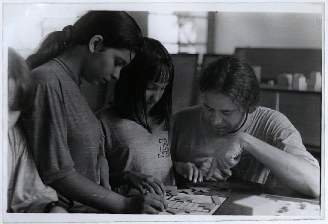 | Description: | Fotografia em preto e branco onde é possível visualizar jovens acompanhadas por uma personalidade não identificada praticando um jogo não identificado. |