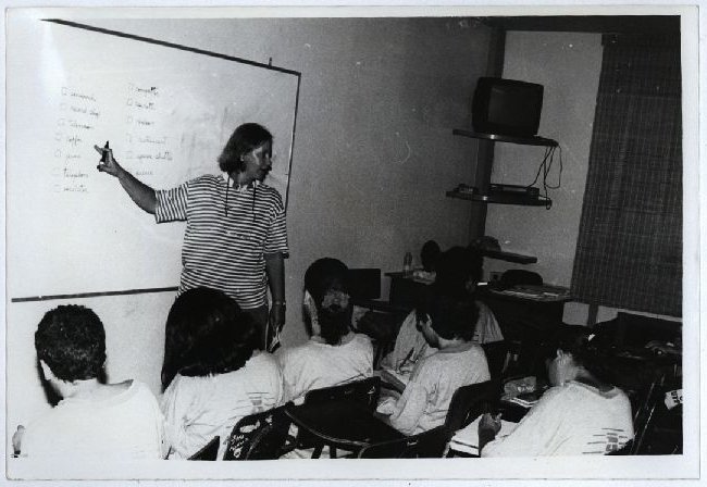 Description: Fotografia em preto e branco onde é possível visualizar diversos alunos atendendo a uma aula ministrada por uma personalidade não identificada, em 1998. No verso da foto consta um adesivo da ASCOM com as seguintes informações: “Assessoria de Com. Social; Data/Local: 18.03.98; Evento/Pessoa: Sala Aula CE; Fotógrafo: Francisco Paiva”.