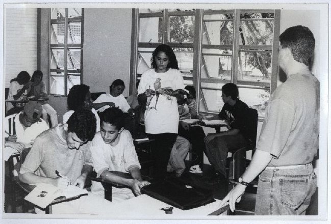 | Description: | Fotografia em preto e branco onde é possível visualizar diversos alunos atendendo a uma aula ministrada por uma personalidade não identificada, em 1998. No verso da foto consta um adesivo da ASCOM com as seguintes informações: “Assessoria de Com. Social; Data/Local: 18.03.98; Evento/Pessoa: Sala Aula CE; Fotógrafo: Francisco Paiva”. |