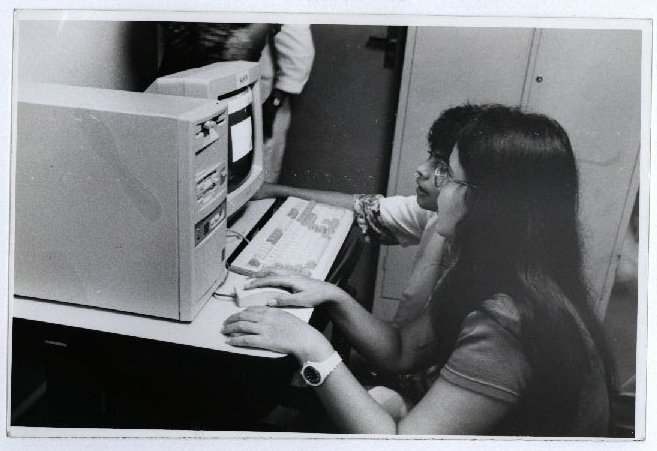 Description: Fotografia em preto e branco de dois alunos no laboratório de informática utilizando um computador.