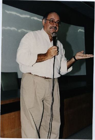Descrição: Fotografia em cores onde é possível ver o professor João Francisco em pé segurando um microfone em momento de fala no Evento sobre Alfabetização Solidária. No verso da foto consta um adesivo da ASCOM com as seguintes informações: “Assessoria de Com. Social – UFPE; Nome: Prof. Alfabetização solidária – Centro de Educação; Evento/Pessoa: Prof. João Francisco; Fotógrafo: Mila Targino; Nov.2000”.