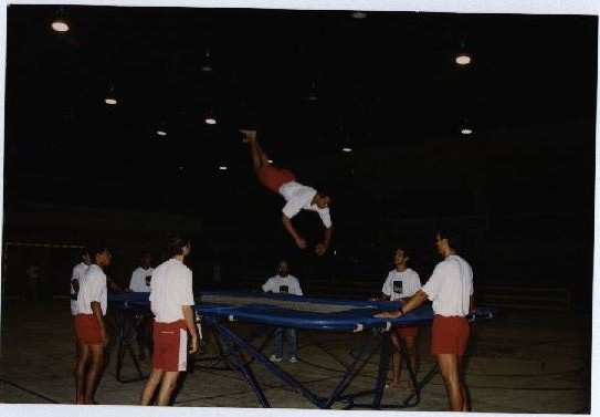 Description: Fotografia em cores onde é possível visualizar pessoas não identificadas ao redor de uma cama elástica na qual está uma pessoa em momento de salto. No verso da foto consta a seguinte informação escrita à caneta: “Filme 6787”.