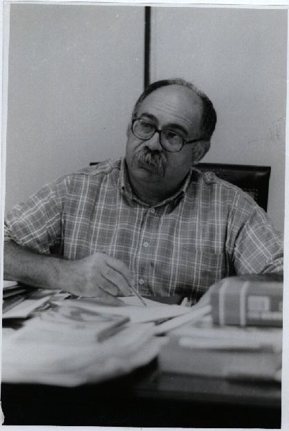 Description: Fotografia em preto e branco onde é possível visualizar o diretor do Centro de Educação João Francisco de Souza sentado à mesa segurando uma caneta sobre o papel. No verso da foto consta um adesivo da ASCOM com as seguintes informações: “Assessoria de Com. Social – UFPE; Unidade/Data: 20,11,97 CE; Evento/Pessoa; Fotógrafo: Francisco Paiva”.
