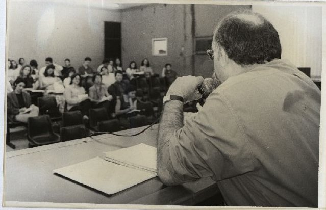 | Description: | Fotografia em preto e branco onde é possível ver um público sentado em um auditório. Na mesa se encontra sentado o diretor do Centro de Educação João Francisco de Souza em momento de fala o microfone. |