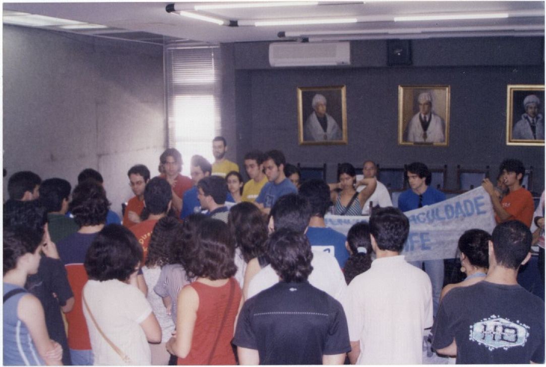 | Description: | Fotografia em cores onde é possível visualizar um grupo de pessoas reunidas em um local não identificado. No verso das fotos consta um adesivo da ASCOM com a seguinte informação: “Assessoria de Com. Social – UFPE; Nome; Evento/Pessoa: Protesto Estudantes de Direito. Reitoria; Fotógrafo: Vitória; 06/07/2004”. |