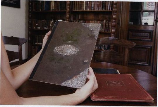| Descripción : | Fotografia em cores onde é possível visualizar mão que seguram um livro com a capa danificada, livros fechados sobre uma mesa. No fundo da imagem aparem cadeiras e uma estante com livros. No verso da foto consta um adesivo da ASCOM com a seguinte informação: “Assessoria de Com. Social – UFPE; Nome: Fac. Direito; Evento/Pessoa: Acervo Livros Raros; Fotógrafo: Bárbara Wagner; 13.03.02”. |