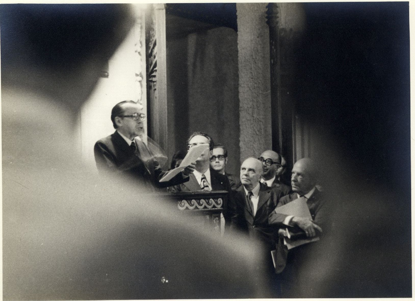 Description: Fotografia em preto e branco de homem discursando em evento da Faculdade de Direito do Recife.