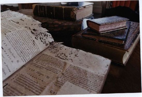 | Description: | Fotografia em cores onde é possível visualizar livros sobre à mesa estando um deles aberto e com páginas danificadas. No verso da foto consta um adesivo da ASCOM com a seguinte informação: “Assessoria de Com. Social – UFPE; Nome: Fac. Direito; Evento/Pessoa: Acervo Livros Raros; Fotógrafo: Bárbara Wagner; 13.03.02”. |