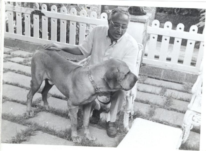 Descrição: | Fotografia em preto e branco do professor Souto Borges com um cão no jardim |