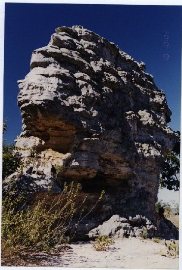 Description: Fotografia em cores onde é possível visualizar uma rocha grande. No verso das fotos consta um adesivo da ASCOM com as seguintes informações: “Assessoria de COM Social – UFPE; Nome: CFCH – Arqueologia/ECO; Evento Pessoa: Universidade p/ Todos; Fotógrafo: Mila Targino; Junho 2001”.