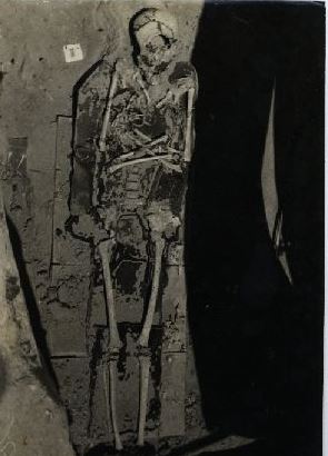 Descrição: Fotografia em preto e branco onde é possível visualizar um esqueleto humano em escavação em sítio arqueológico não identificado. No verso da foto consta a seguinte informação escrita à caneta: “Centro de Filosofia”. E escrito a lápis consta: “Arqueologia”.