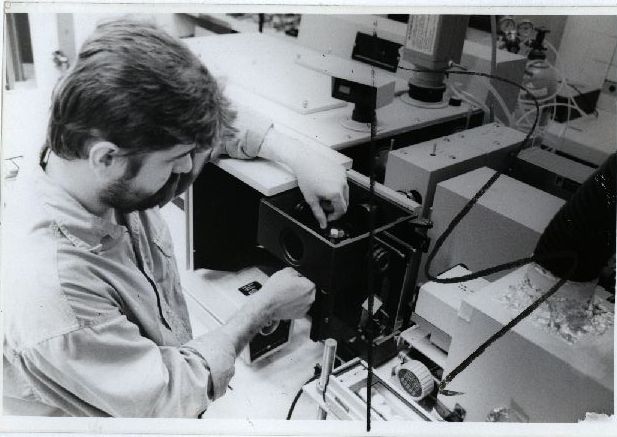 Description: Fotografia em preto e branco onde é possível visualizar o professor Petrus manuseando equipamentos laboratoriais - CCEN/NASA. No verso da foto consta um adesivo da ASCOM com a seguinte informação: “Assessoria de Comunicação Social – UFPE; Unidade/Data: 02.09.97; Evento/Pessoa: Prof. Petrus/ CCEN NASA; Fotógrafo: Francisco Paiva”.
