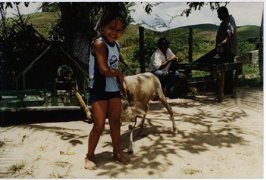 Description: Fotografia em cores onde é possível visualizar uma criança segurando uma corda amarrada a um animal não identificado; no fundo da foto, visualiza-se ainda duas personalidades não identificadas. No verso da foto consta um adesivo da ASCOM com a seguinte informação: “Assessoria de Com. Social – UFPE; Nome: CCSA – Economia – Pesquisa sobre o Pronaf; Evento/Pessoa: Prof. Tarcisio Patrício; Fotógrafo: Mila Targino; Jan. 2001”.