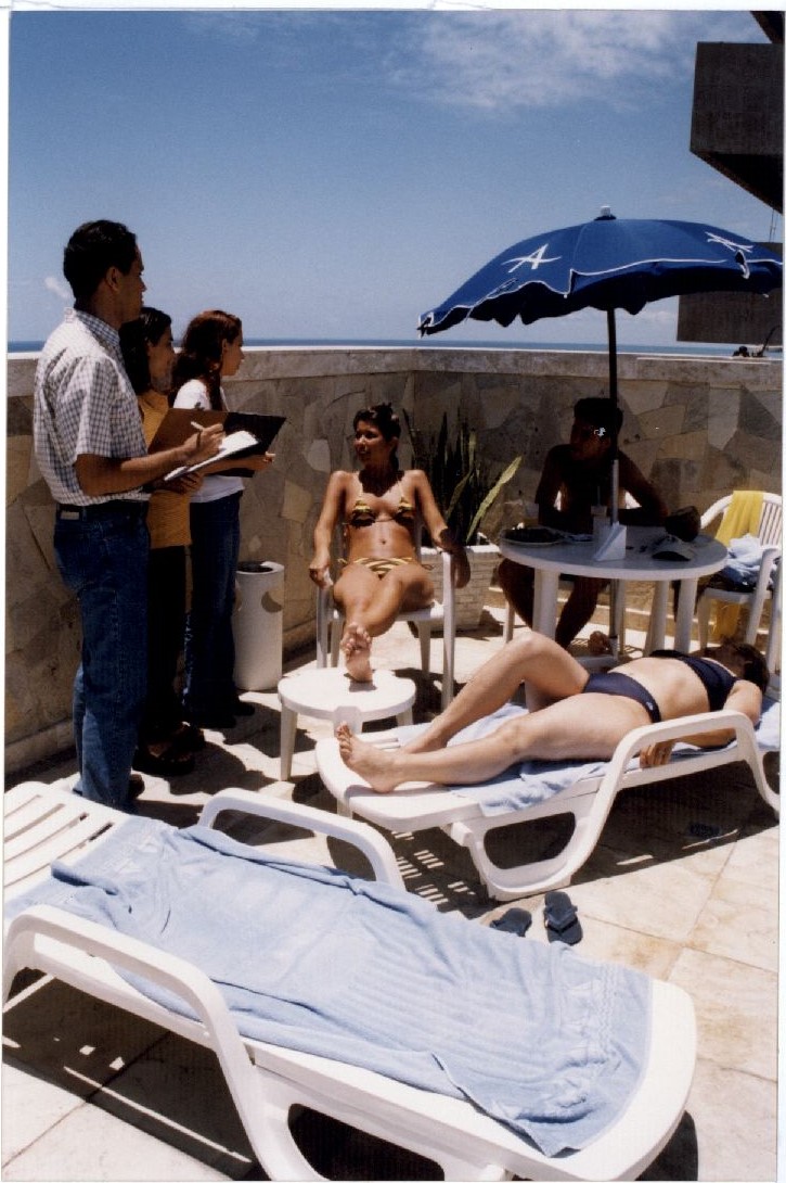 | Description: | Fotografia em cores onde é possível visualizar seis pessoas numa varanda, sendo três deles alunos de administração com roupas formais e pranchetas nas mãos e outras três com roupa de banho em cadeiras de praia. |