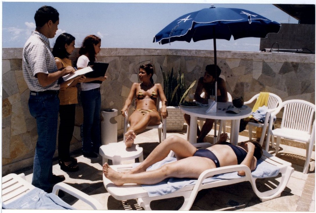 | Descripción : | Fotografia em cores onde é possível visualizar seis pessoas numa varanda, sendo três deles alunos de administração com roupas formais e pranchetas nas mãos e outras três com roupa de banho em cadeiras de praia. |