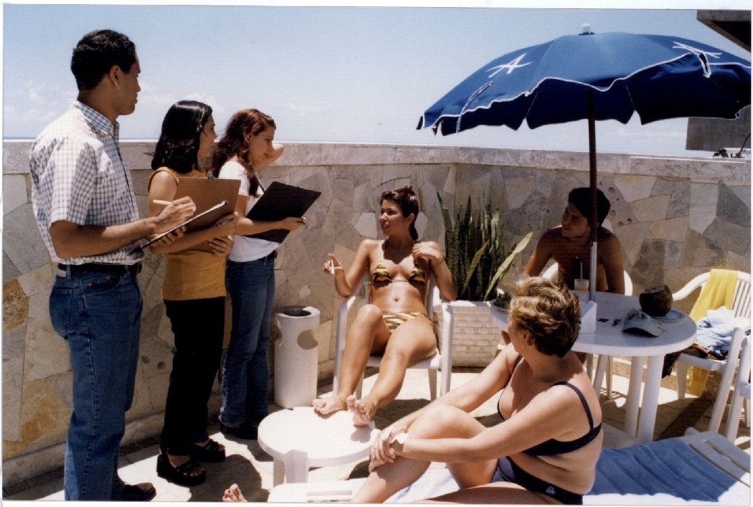 | Descripción : | Fotografia em cores onde é possível visualizar seis pessoas numa varanda, sendo três deles alunos de administração com roupas formais e pranchetas nas mãos e outras três com roupa de banho em cadeiras de praia. |