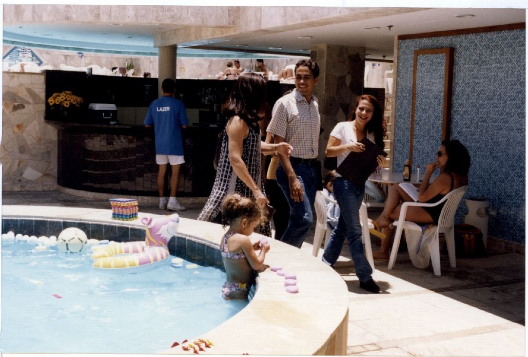 Descripción : Fotografia em cores onde é possível visualizar uma área com piscina na qual está uma criança, três alunos de administração com roupas formal e outras pessoas em momento de laser. Alunos de administração em varanda com pessoas em momento de lazer na piscina