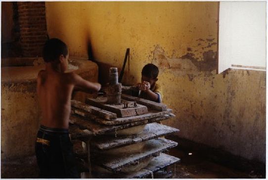 Descripción : Fotografia em cores onde é possível visualizar duas crianças desenvolvendo um trabalho em uma máquina de moer. No verso da foto consta um adesivo da ASCOM com a seguinte informação: “Assessoria de Com. Social – UFPE; Nome: CCSA – Economia – Pesquisa sobre o Pronaf; Evento/Pessoa: Prof. Tarcisio Patrício; Fotógrafo: Mila Targino; Jan. 2001”.
