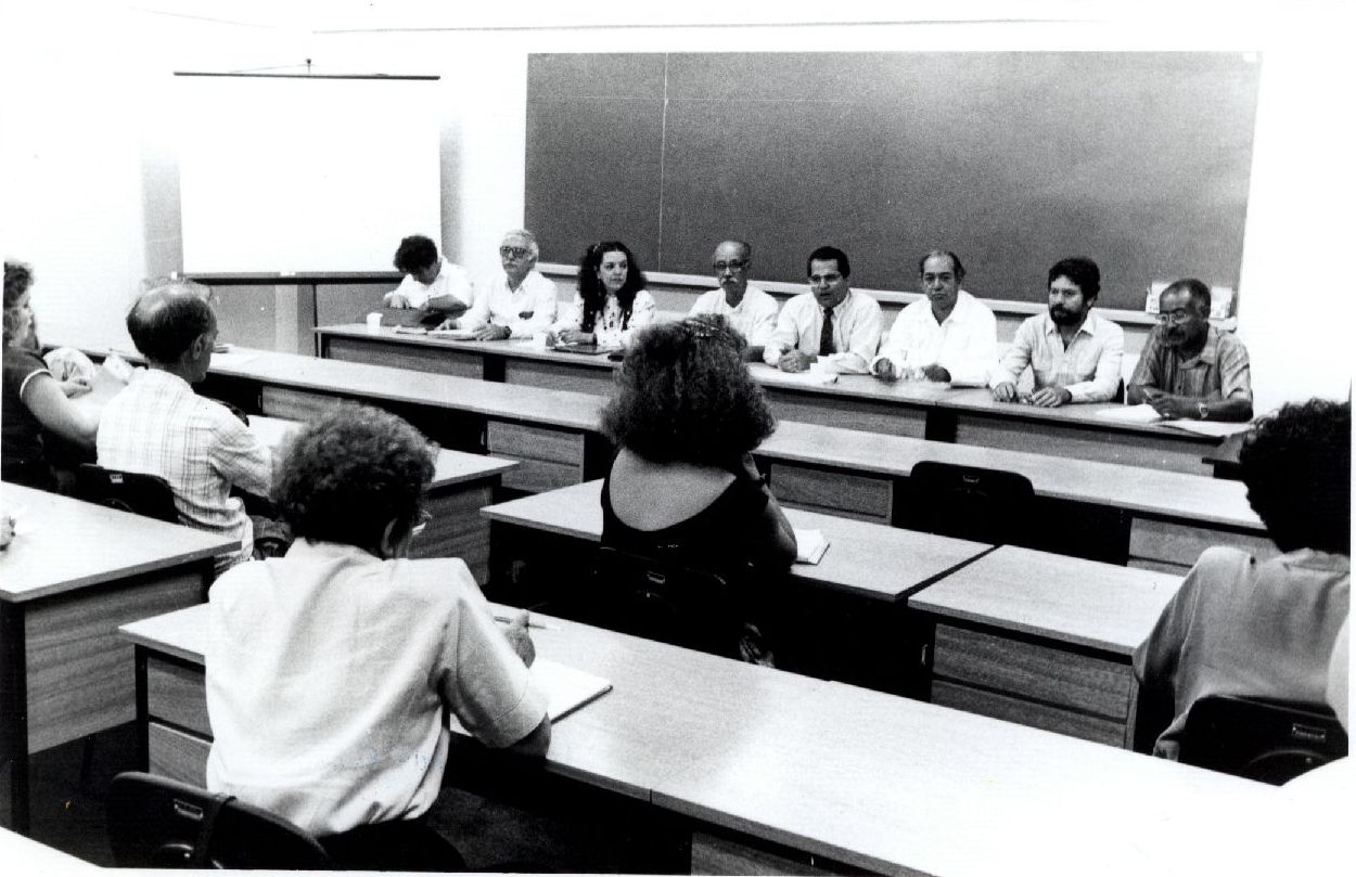 | Description: | Fotografia em preto e branco de diversas pessoas dentro de um ambiente fechado assistindo a uma espécie de palestra ou evento, onde há pessoas sentadas à mesa. No verso da foto consta a seguinte informação: No verso da foto consta um carimbo com a seguinte informação: "Universidade Federal de Pernambuco; Assessoria de Comunicação Social; Maurício Coutinho; Repórter Fotográfico; Reg. Prof. 657 / DRT-PE". |