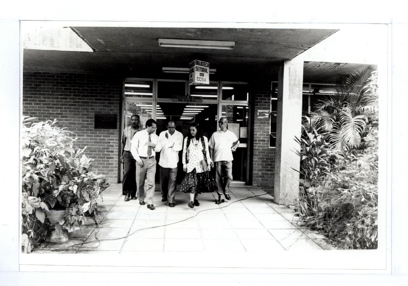 | Description: | Fotografia em preto e branco de equipe saindo da biblioteca setorial do CCSA. No verso da foto consta um carimbo com a seguinte informação: "Universidade Federal de Pernambuco; Assessoria de Comunicação Social; Maurício Coutinho; Repórter Fotográfico; Reg. Prof. 657 / DRT-PE". |
