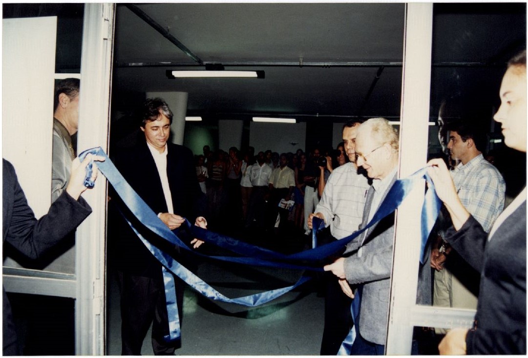 Description: Fotografia em cores do momento que o Reitor Mozart Neves corta a fita de inauguração em evento do CCSA