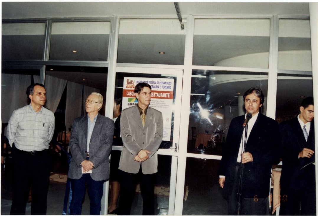 Description: Fotografia em cores do Reitor Mozart Neves ao microfone em frente ao Laboratório de Restaurante do Núcleo de Hotelaria e Turismo