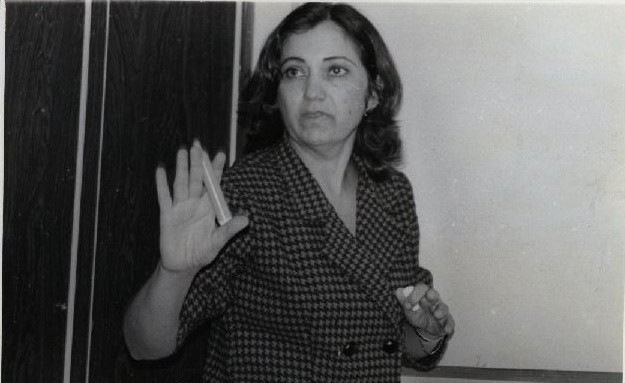| Descrição: | Fotografia em preto e branco onde é possível visualizar uma personalidade identificada como Edileide Freitas ministrando uma aula. |