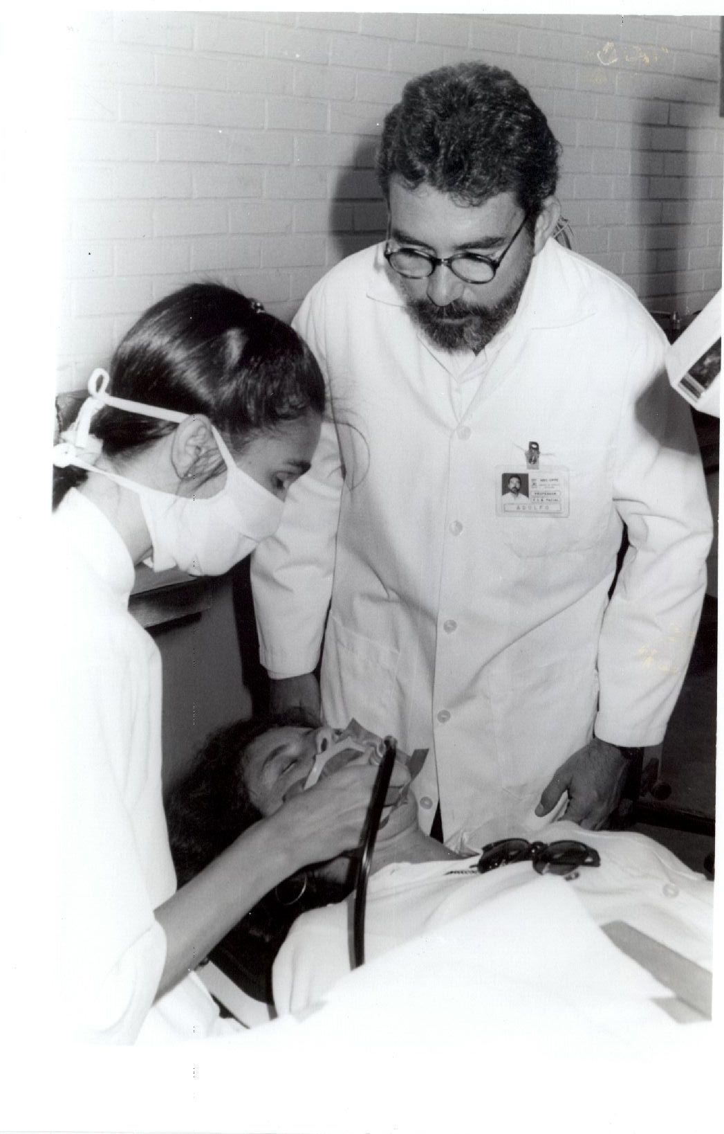 | Descrição: | Fotografia em preto e branco onde é possível visualizar uma paciente recebendo tratamento odontológico de dois profissionais da área. |