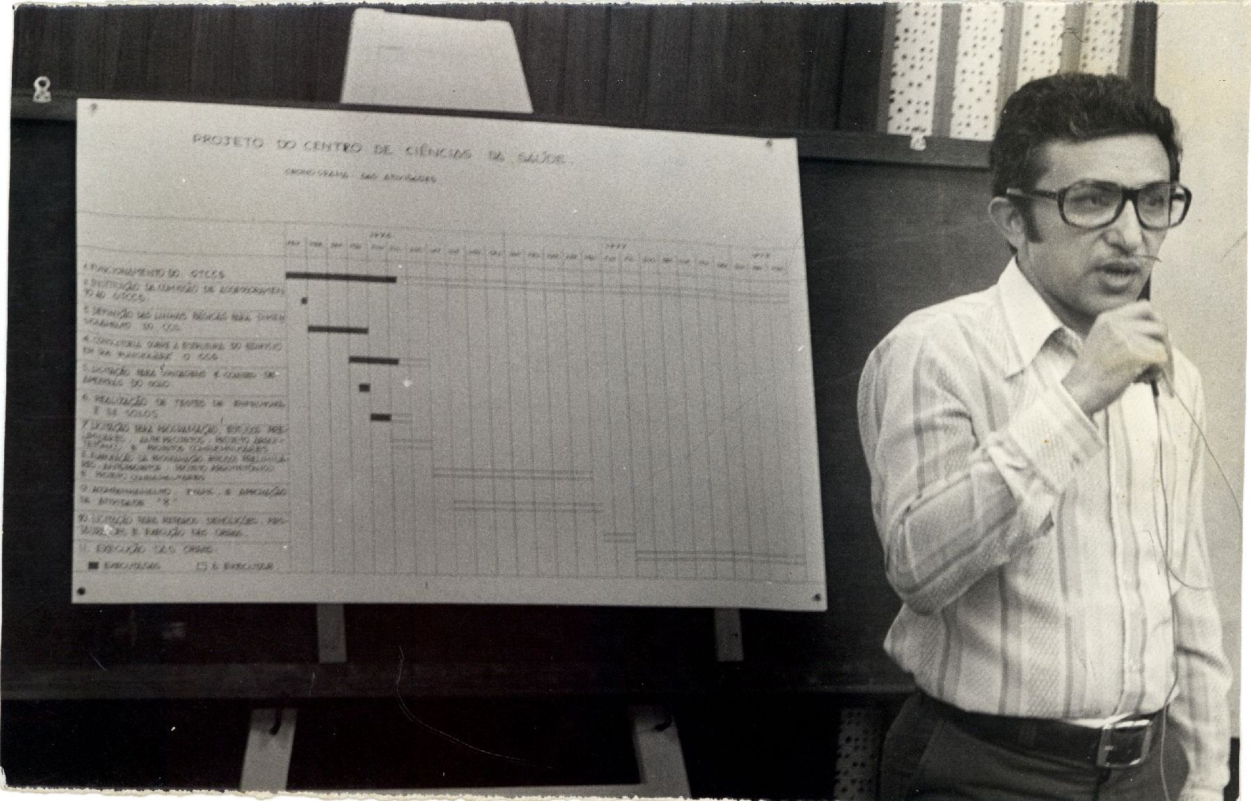 Descrição: Fotografia em preto e branco onde é possível visualizar um homem não identificado em momento de fala em frente a um quadro com tabela em um papel.