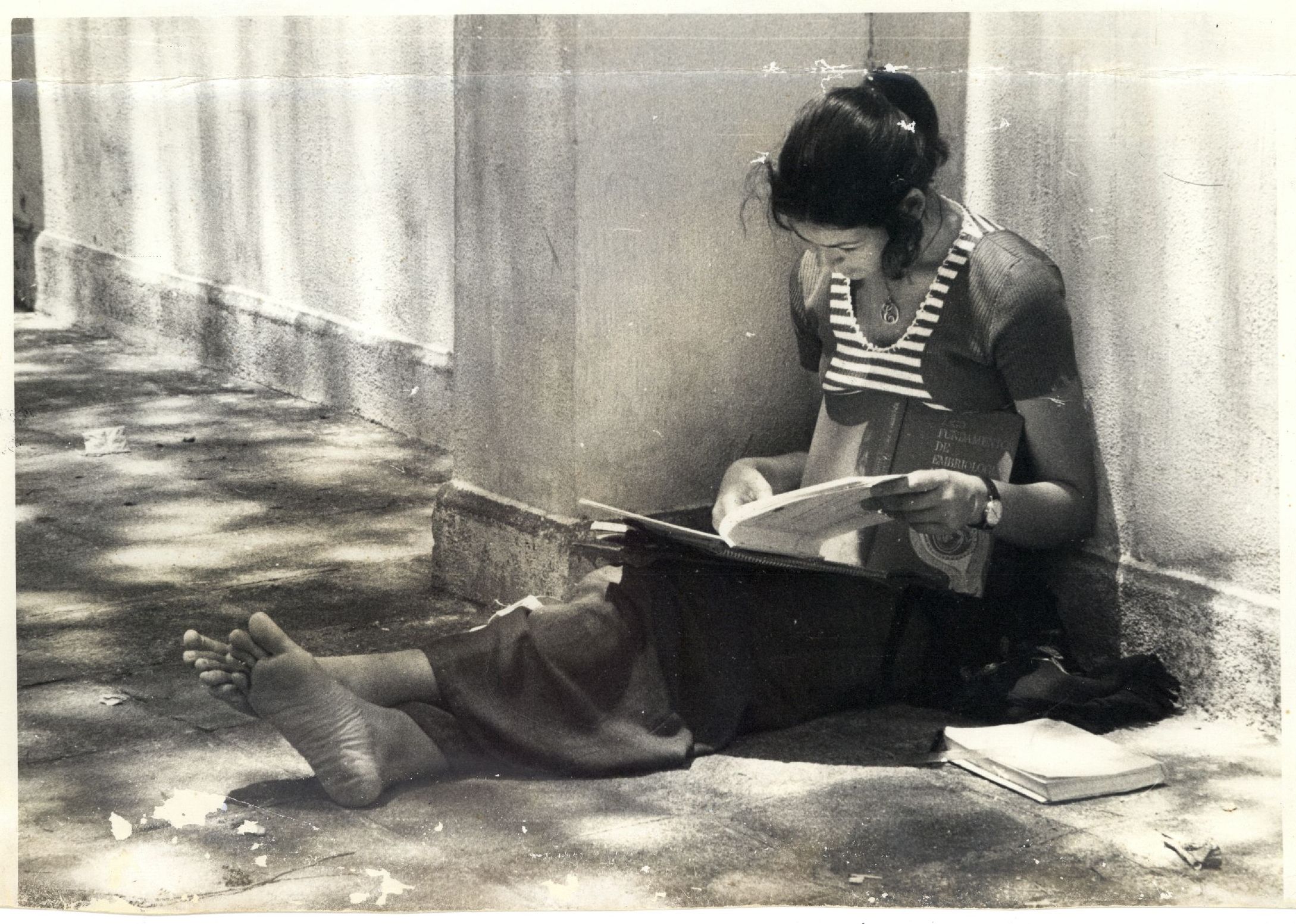 Título: | Registro de uma estudante sentada no chão em momento de leitura - Faculdade de Medicina |