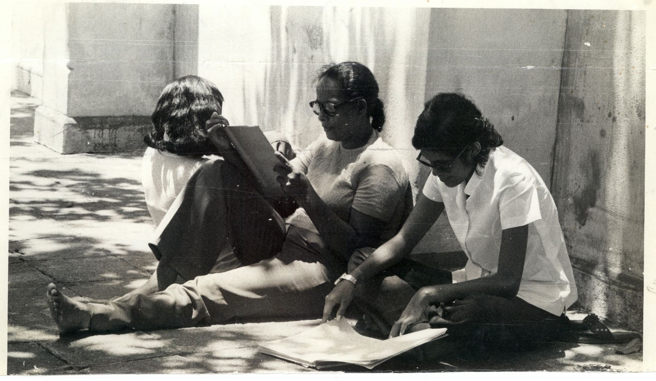 Descrição: | Fotografia em preto e branco onde é possível visualizar três estudantes sentadas no chão em momento de leitura - Faculdade de Medicina. No verso da foto encontram-se as seguintes informações:“Estudando em grupo no {?} da faculdade de medicina”. |