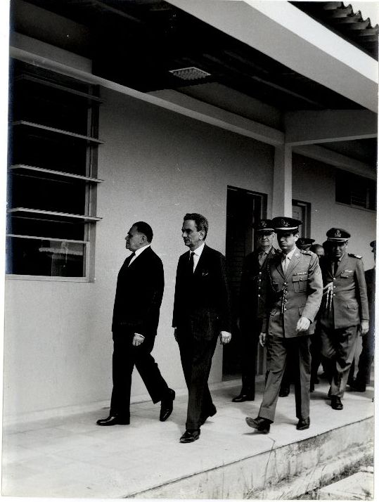 Título: | Presidente Castelo Branco, Reitor Murilo Guimarães e militares caminhando pela Universidade |