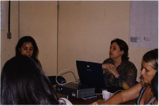 Descrição: | Fotografia em cores onde é possível visualizar mulheres não identificadas sentadas à mesa estando uma delas de frente para um notebook. |