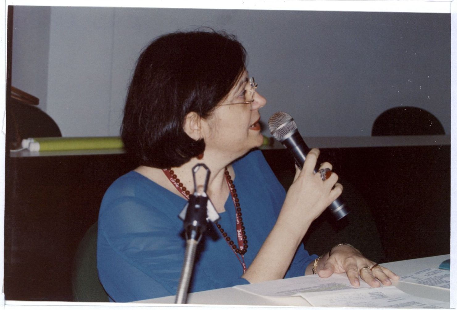 Descrição: | Fotografia em cores onde é possível visualizar Ana Arcoverde em momento de fala ao microfone na mesa diretiva do evento Saber Viver. No verso da foto consta um adesivo da ASCOM com a seguinte informação: "Assessoria de Comunicação Social – UFPE Nome: Ana Arcoverde; Evento/Pessoa: Saber Viver; Fotógrafo: Xavana Celesmah; 13.12.05”. |