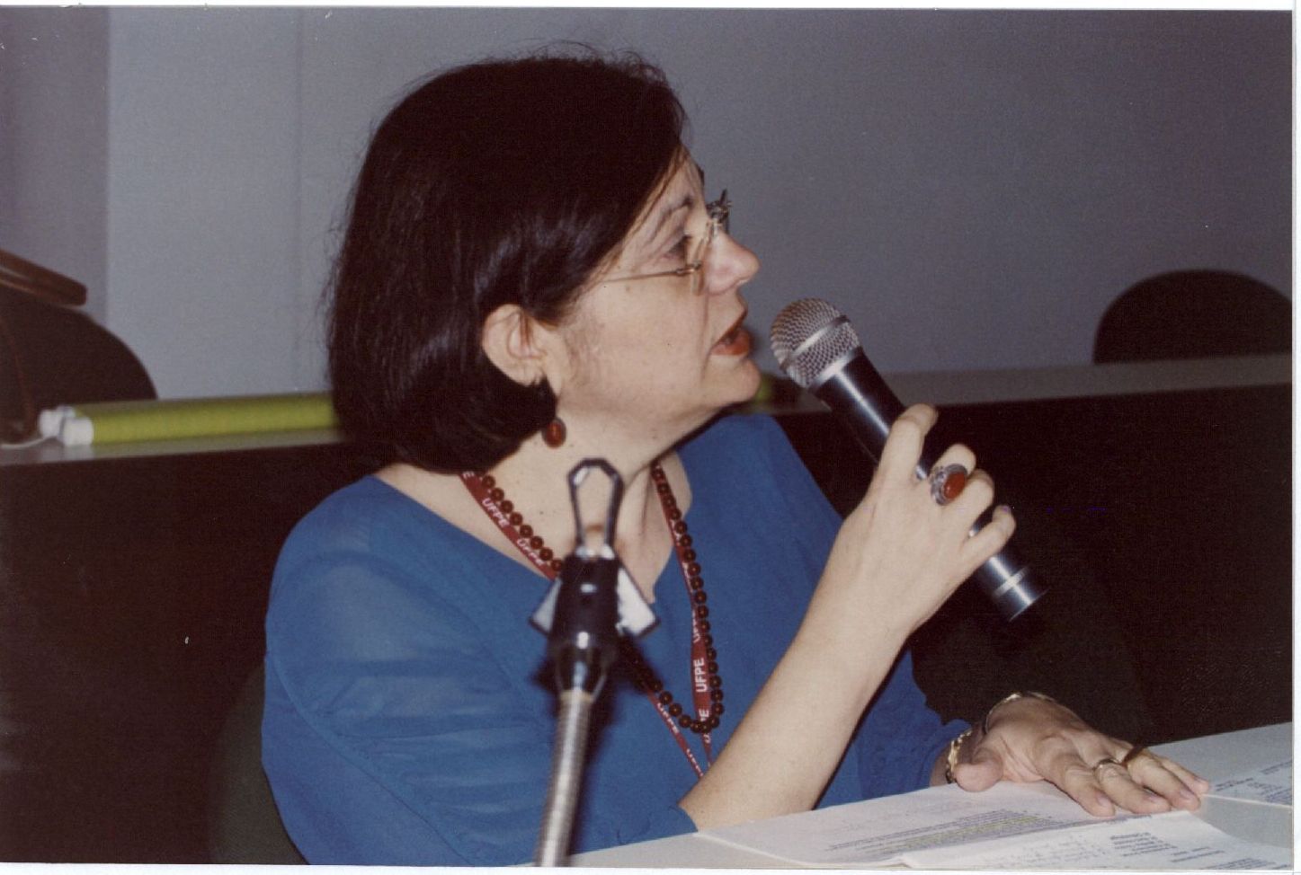 Descrição: Fotografia em cores onde é possível visualizar Ana Arcoverde em momento de fala ao microfone na mesa diretiva do evento Saber Viver. No verso da foto consta um adesivo da ASCOM com a seguinte informação: "Assessoria de Comunicação Social – UFPE Nome: Ana Arcoverde; Evento/Pessoa: Saber Viver; Fotógrafo: Xavana Celesmah; 13.12.05”.